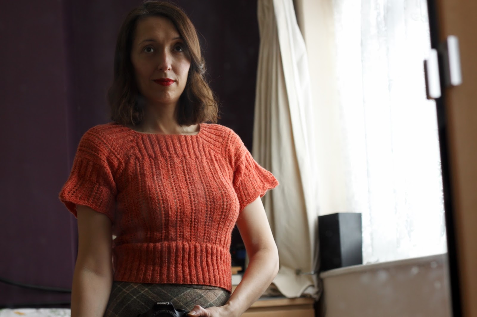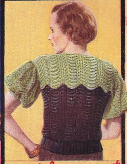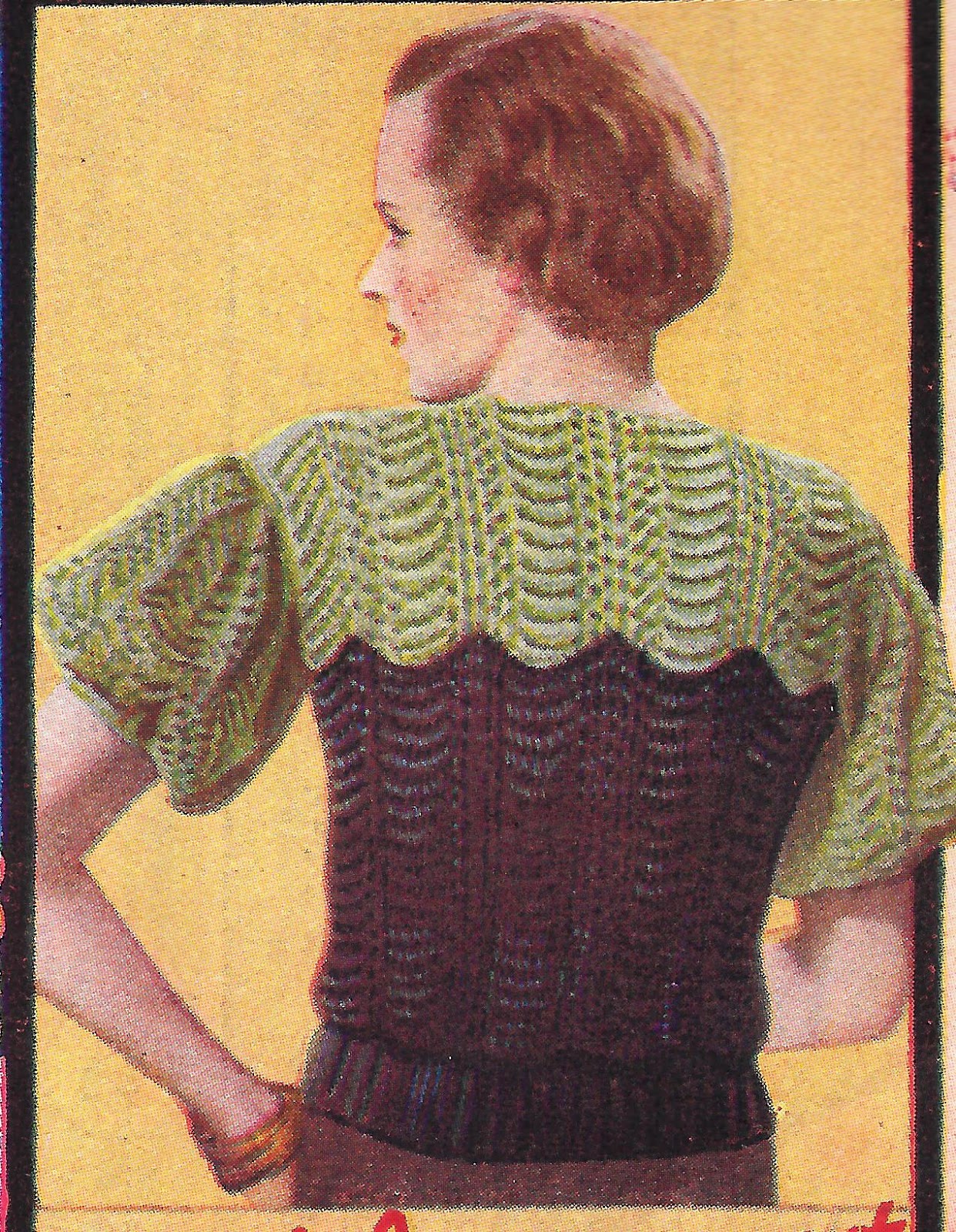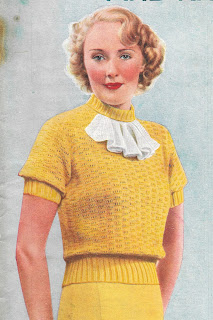 The last jumper from the Good Needlework series is from 1938. The cut-outs at the neckline were too much to resist. Teamed with leaf-patterned lace and ribbing, what's not to love?